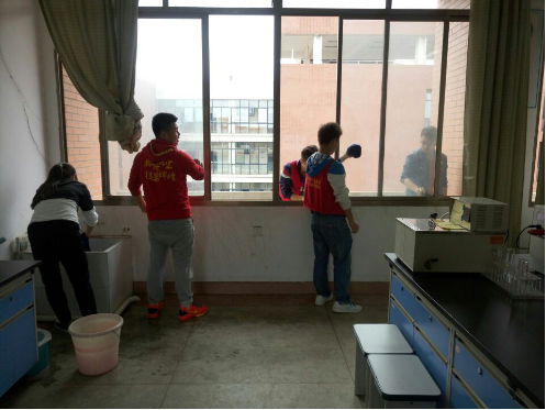 9点,清扫活动正式开始。在实验室老师强调实验药品安全注意事项后,志愿者们有条不紊,分工明确,化工楼五个楼层的清扫同时展开。偌大的化工楼没有一丝嬉戏打闹的声音,有的只是同学们默契配合、相互协作的交流。每个参与活动的志愿者都埋头肯干,充分发挥了不怕脏,不怕苦,不怕累的精神。活动如火如荼的进行着,转眼间,墙壁上的污渍,水池里的泥垢,地面上的垃圾,门上的牛皮癣……都被清理得干干净净,实验仪器和药品也被摆放得整整齐齐。钟桐生副书记与陈艳姣老师在活动中亲力亲为,起到了积极的示范与指导作用。历时两个多小时的清理打扫活动就在志愿者们凝聚着汗水的笑脸中圆满结束。
