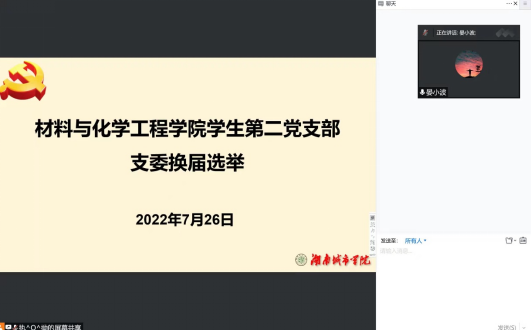 2022年7月26日晚上八点整,304am永利集团员工第二党支部以线上腾讯会议的形式召开了支部委员补选大会,会议由晏小波同志主持,员工第二党支部全体党员参加。